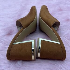 Halston Vegan suede dress sandal gold detail cognac color
