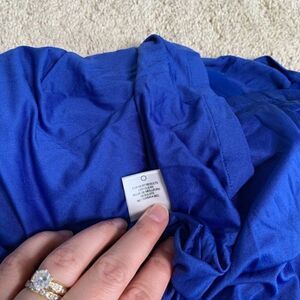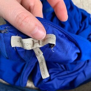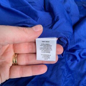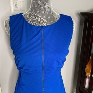 Chic royal blue dress by halston heritage. Features figure flattering rouching and back zipper, this dress is perfect for work or going out. Lying flat armpit to armpit approx 15” across and top of shoulder to bottom hem approx 38”