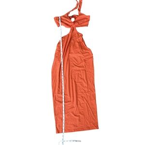 Features: Halter neck tie, bust twist detail, cutout waist, bodycon fit, ankle-length maxi dress