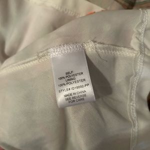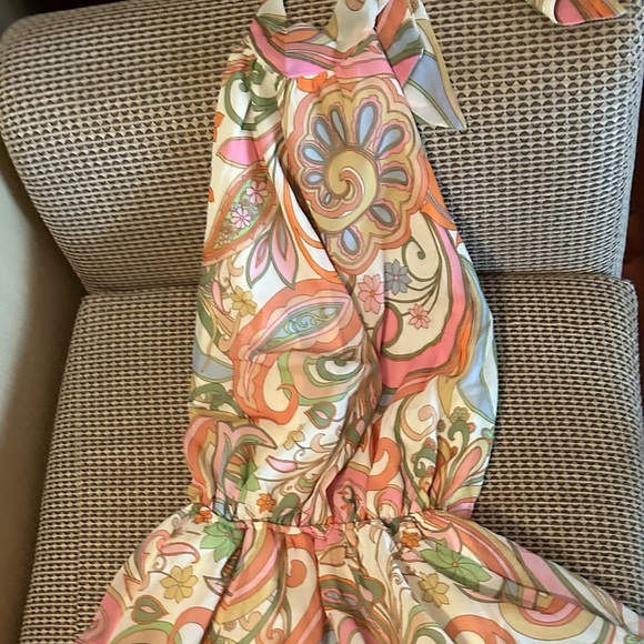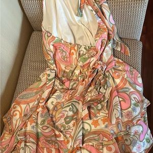 This halter dress, worn only once, has a fun, retro vibe and is fully lined. I am 5’ 4”, and it hits slightly above the knee. The top has some stretch to it, and there is a ruffle at the bottom.