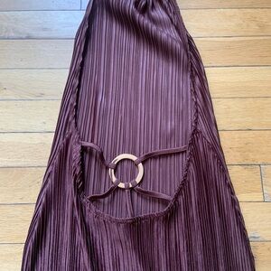 The color of the dress is brown. Features a halter neck with two buttons to secure and an open back with gold hardware detailing. Material is plisse like and the dress stops right above your ankles if you are 5’4 and under. Very comfortable and stretchy with the body. Never worn.
