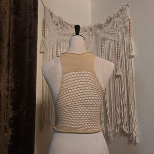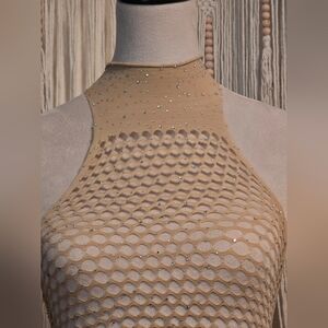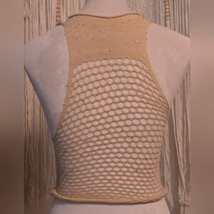 O/S halter crop top with a fishnet design. Features delicate rhinestone accents for subtle sparkle. Flattering high neckline and sleeveless cut.