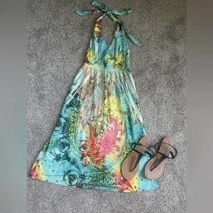 Halter mini dress in tropical/floral/damaske print. Gently used- DRESS ONLY!