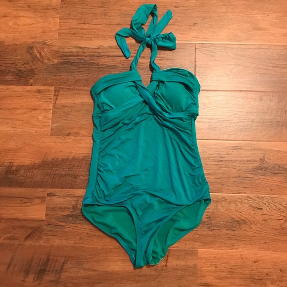 Lightly used swimsuit with tie-halter and ruching. Bright green color is perfect for warmer weather. Padded and comfortable, sturdy fabric. Fits true to size.