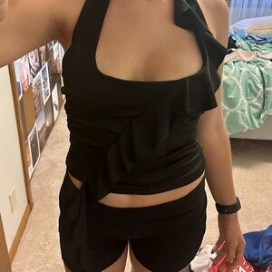 Black halter A-symmetrical ruffle crop tank top! NWTs from Pitaya Boutique. Stretchy material and fit. Super cute for a night/dinner out or just dressing up.