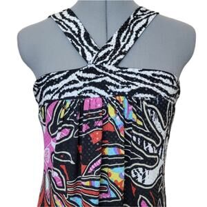 Make a bold statement in this eye-catching halter dress by Mesmerize. Designed with a vivid abstract print, sequin accents, and a zebra-striped crisscross halter neckline, this dress is perfect for a night out, party, or special event. Crafted with stretch fabric for a flattering, comfortable fit.