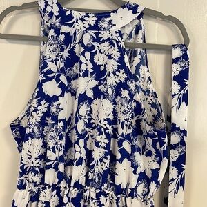 Halter style Maxi Dress. Has the Ruffled layered look bottom half of dress. Great Spring /Summer addition pit to pit 20” shoulder to hem 57” Comes with small matching belt