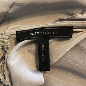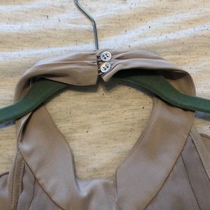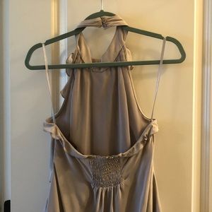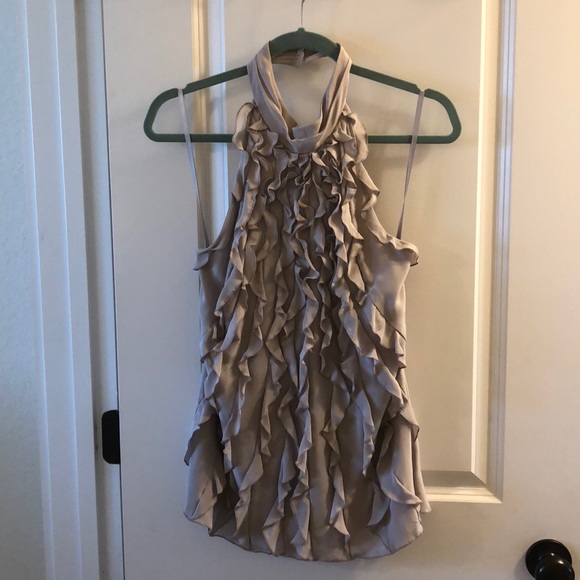 This is a light grey-ish purple halter top that includes ruffles down the front. It singes in the back for shape & is a light material perfect for going out!