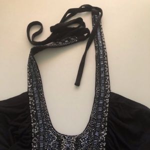 Modal/Spandex fabric ruched back slightly pleated around bib not tight fitting.