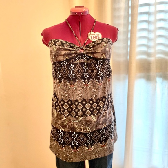 Black Halter Top W/ Grey, Black & Redish/Brown Pattern. Never Worn. Long Top.