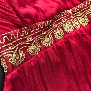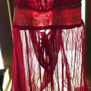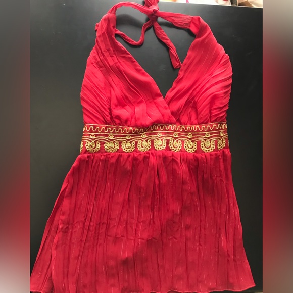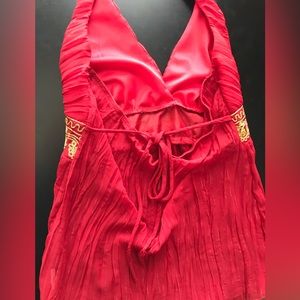 This red halter top features delicate bohemian style vibes with demure metallic threading and sheer flowy bottom, reminiscent of Bollywood charm. Also has adjustable tie in the back for a perfect fit.