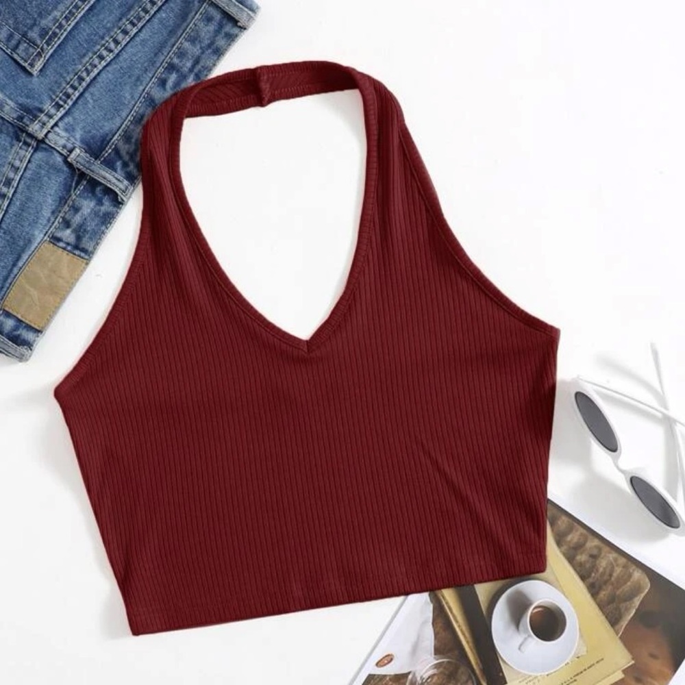 Maroon Red Ribbed Halter Top. Lightweight, breathable and stretchy material.