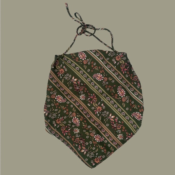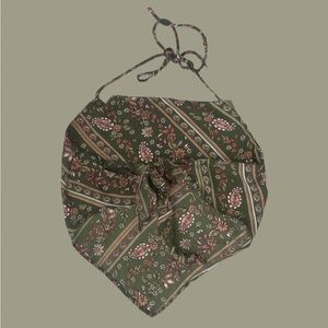 Green floral halter top. V shape at the bottom, ties at the neck and at the back. Light and fresh material.