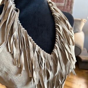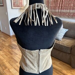 Wilson’s Leather Maxima Suede Halter Top with zip back and snaps at the neck. Beautiful, fully lined, sexy piece! Waist to waist 16 1/2”, bust to bust 17”, length 20”