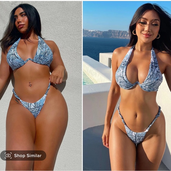 No stains or damages. Brand new with tags. Halter print bikini set. Top is wired. And bottom is very cheeky and sexy.