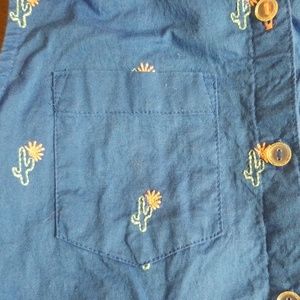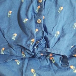 Cute royal blue with cactus designs. Never worn. Cute little opening in back and has tie knot.at bottom of blouse.
