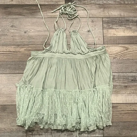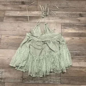 Mini halter dress, open back, lace bottom, gauze-like fabric, green, sz S.