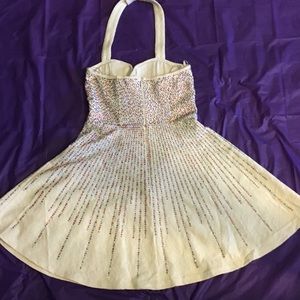 Gold label halter sweetheart dress. Ivory dress with ivory liner. This dress is outlined with lace. I tried to capture this in the pictures. Zipper back.