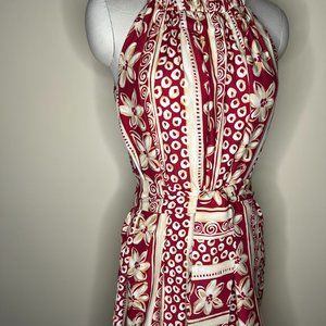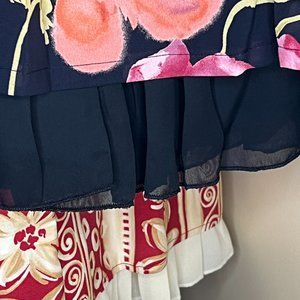 this listing is for both dresses. The black is a fully lined polyester foral chiffon. The rust and cream dress is a batik style rayon print with a cream colored polyester chiffon lining and tie back and has an additional self tie waist belt. both are new, never worn, in excellent condition
