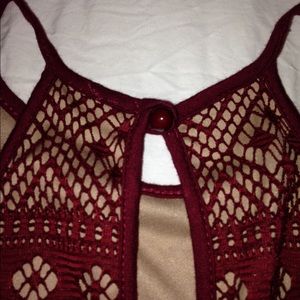 Red wine embroidered halter top. Size Small! Super cute! Never worn, although I did take the tags off because I figured I would wear it one day but never did. It fits true to size and looks super cute with olive pants! :)))