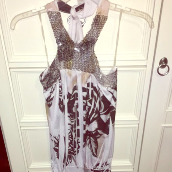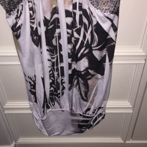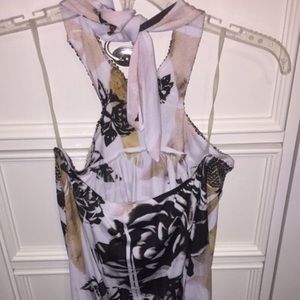 Thicker material, new with tags, flower design on the bottom of the shirt, ties around the neck