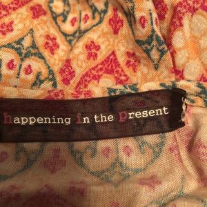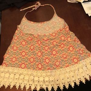 ADORABLE halter top by happening in the present. Size small. In excellent used condition. Flowy at the waist with the cutest crochet pattern all around. Ties at neck.