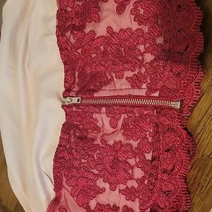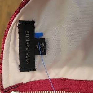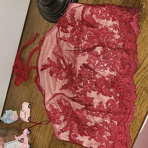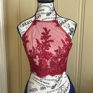 Red sheer lace over a nude halter by Miss Avenue. Zips up in the back, has hook and eye clousure, and also ties around neck.