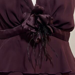 J. R. Nites burgundy chiffon formal halter top; deep neckline; tiered ruffles. zip closure. Decorative satin and black feather rosette; worn once. Pairs beautifully with the black Adrianna Papell tiered ruffled skirt also for sale on my page.