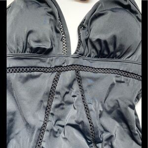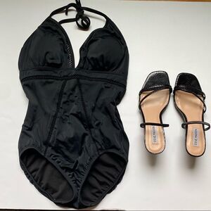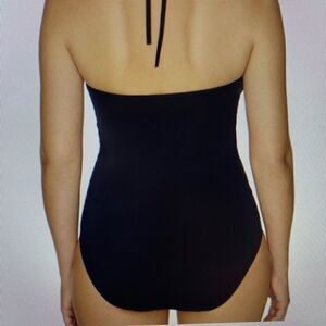 It’s all In the details of this figure flattering Rich black halter one-piece swimsuit. Strategically placed seams and contours in all the right places. Lightly padded bra. Like new.