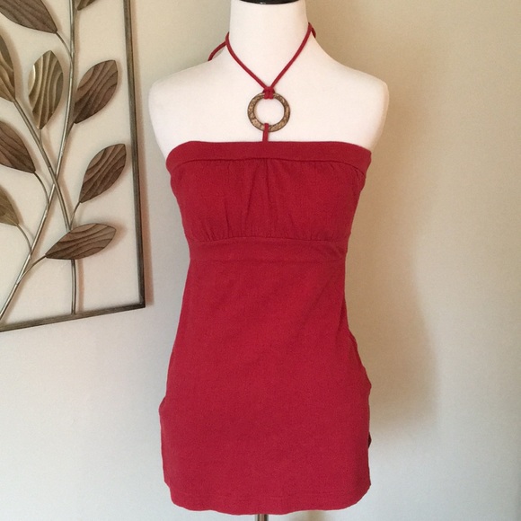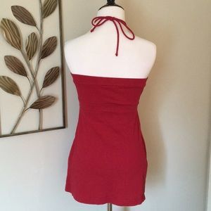 This top is slightly longer. If you’re looking to cover some of your booty, this is a good one for you. It is fitted and the halter can be tucked down in or worn out and tied. Perfect condition.