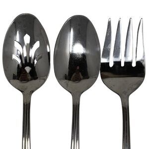 Hamilton Silversmiths American Classic Stainless 3 Piece Serving Set Flatware. Set includes Serving Spoon, Pierced Serving Spoon & Medium Cold Meat Serving Fork. Discontinued/retired Pattern.