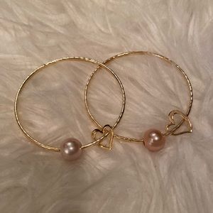 Hamilton two gold straight bangles with hearts charms and pink & off white shell pearl bracelet.
