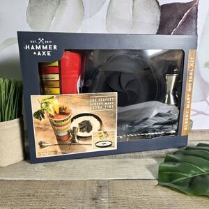 The Hammer + Axe Bloody Mary Bar Tool Kit includes a recipe glass, a twisted spoon stirrer, a double-sided jigger, and a cocktail rimmer.
