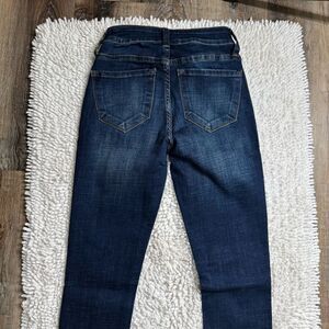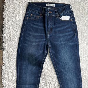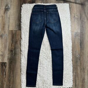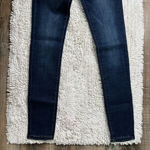 Mid Rise Dark Blue Skinny Jeans In beautiful dark stone wash stretch denim with soft fading and whiskers.