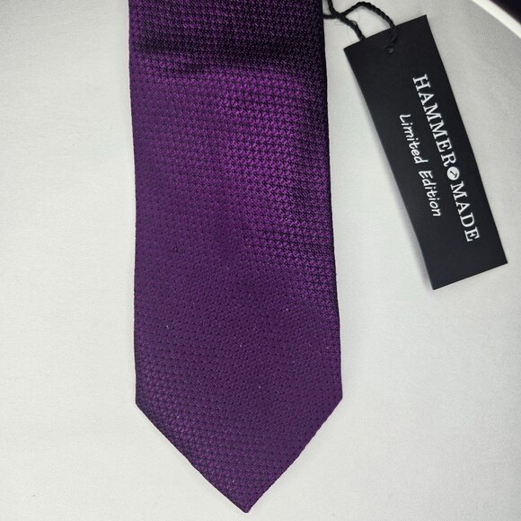 The Hammer Made Limited Edition All Silk Solid Purple Neck Tie is a high-quality designer accessory for men, featuring a classic solid pattern in a luxurious silk blend material. Made in Italy, this long tie showcases intricate embroidered accents and a vibrant purple color that adds a touch of sophistication to any outfit. With its adjustable fit and stylish design, this limited edition tie is perfect for those who appreciate fine craftsmanship and Italian elegance in their wardrobe choices.