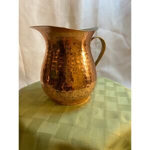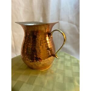 Shiny Hammered Copper Pitcher Vase with Brass Handle, Decorative only. Not for food use. Patina showing on one side otherwise Very Good pre-owned condition. Approximately 6 1/2 inches tall. X 6 1/2 inches across widest part of top. Please examine all pictures as they are part of the description. Any imperfections are disclosed to the best of my knowledge.