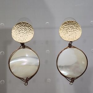 Search Terms: Drop earrings, mother-of-pearl earrings, gold disc earrings, bronze wire earrings, iridescent jewelry, elegant earrings, sophisticated jewelry, daytime earrings, evening earrings, fashion earrings, statement earrings, chic earrings, designer earrings, handmade earrings, unique earrings, shimmering earrings, versatile earrings, must-have earrings, trendy earrings, accessory essentials.
