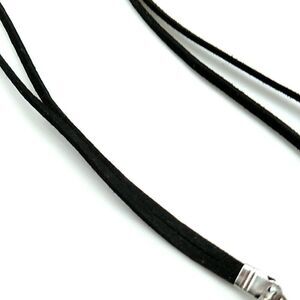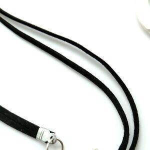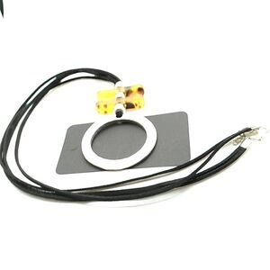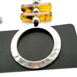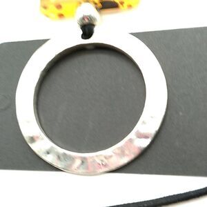 ♦ Black leather cord, two amber-colored rectangular beads, and a hammered silver-toned ring pendant.