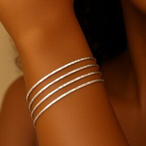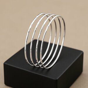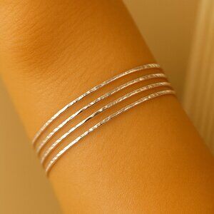 Elevate your bracelet stack game with this set of four ultra-slim sterling silver hammered bangles, handcrafted from durable sterling silver jewelers wire. Each cuff bracelet is just 0.8 mm thick for a barely-there feel, yet boasts a radiant, high-polish finish and subtle facets from expert hammering. Wear them together for a chic layered look or mix with other styles—perfect for everyday, office wear, and special occasions. OR you can choose from other selections of widths for each bangle in the drop down menu.