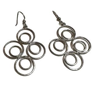 Silver dangle earrings with concentric circle pattern. French hook earrings. Possibly hammered sterling silver, but unstamped. Excellent condition. Measure approx 1.25 x 2.25" and weigh a total of 6 grams.