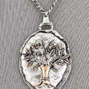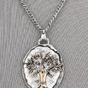 Oh the fashion statement this piece is. I love the hammered look. The tree design is beautiful in detail. Main metal is alloy and copper. Has and 18" chain with 3" extender.