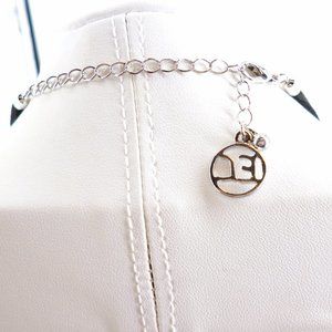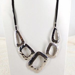 This pretty bib necklace features a hammered metal bib with a black cord "chain". It is adjustable from 18" - 21" and is in perfect condition. It is on the original card and also has the paper tag with a price of $32.00. It is in perfect condition.