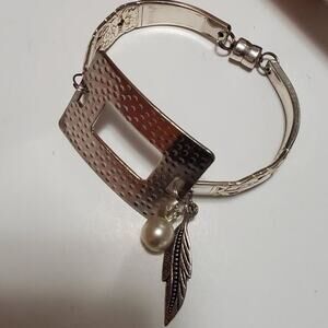 Handcrafted item. Square Vintage Spoon Bracelet .This bracelet is made from the handles of two silver plated forks or spoons. The connector in the center of the bracelet is a bali square.With a 6mm mother of pearl in the center and silver leaf dangle. It has a very strong magnetic clasp.