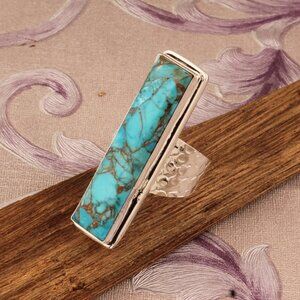 925 Sterling Silver Blue Copper Turquoise Rectangle Gemstone Ring.