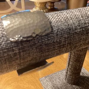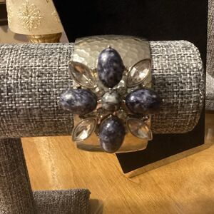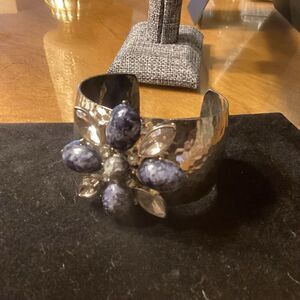 This shiny silvertone cuff which is 1 1/2” wide has a hammered finish. It features a large flower made of black and white stones and clear diamond shaped crystals set in bezels. The flower has a 2” diameter. Easy on and off open cuff could fit up through an 8 1/2” wrist.