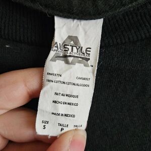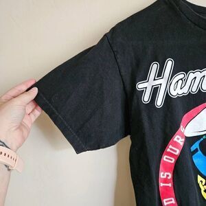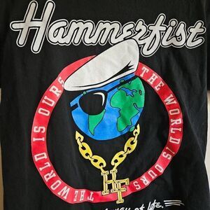 This is a short sleeved t-shirt from the band Hammerfist. It is black and features the band name in white. There is a print of the Earth with a hat, eye patch, and gold chain. Note a small spot of discoloration in photo 5.