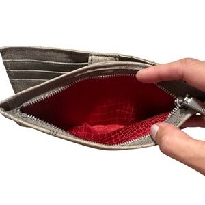 Meet Taryn — the Hammitt 110 North Wallet in Brushed Gray Natural. Crafted from luxe distressed leather with taupe undertones, this designer wallet is the perfect balance of timeless elegance and modern functionality. Featuring Hammitt’s signature brushed silver rivet hardware, magnetic closure, and bold red croc-embossed lining, it’s both a style statement and an everyday essential. The compact silhouette easily slips into your favorite handbag while offering ample storage to keep you organized on the go.