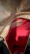 Front flap magnetic closure; opens to reveal a top-zip closure; red suede interior lining