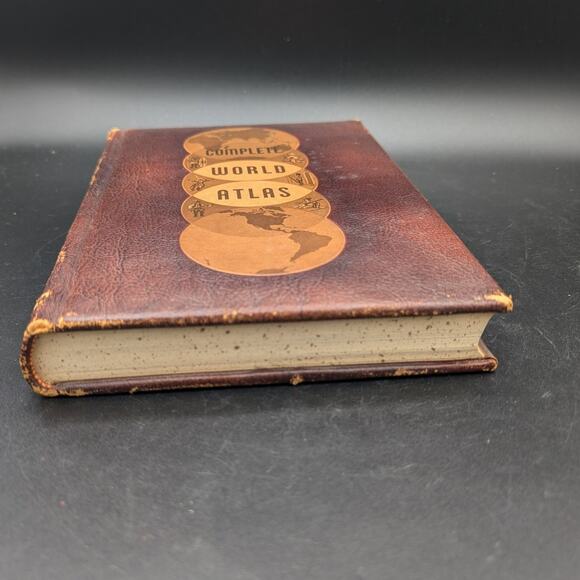Hammond's Complete World Atlas Book. Bound in Handcrafted Mission Leather. Copyright 1961. Full of colorful Maps. It is Brown leather with Globes on the front. The book is in Acceptable condition with some damage to the leather, photographed. One spot on the spine at the bottom of the book has leather coming away or torn, photographed. See photos for details and if you need more info, please message me.