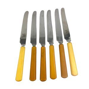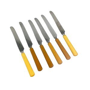 This charming set of vintage dinner knives features yellow and brown Bakelite handles paired with stainless steel blades. Ideal for collectors or for adding a nostalgic touch to your dining experience, these knives offer both functionality and a delightful retro aesthetic. Each knife's unique handle color adds a playful yet elegant element to your table setting.